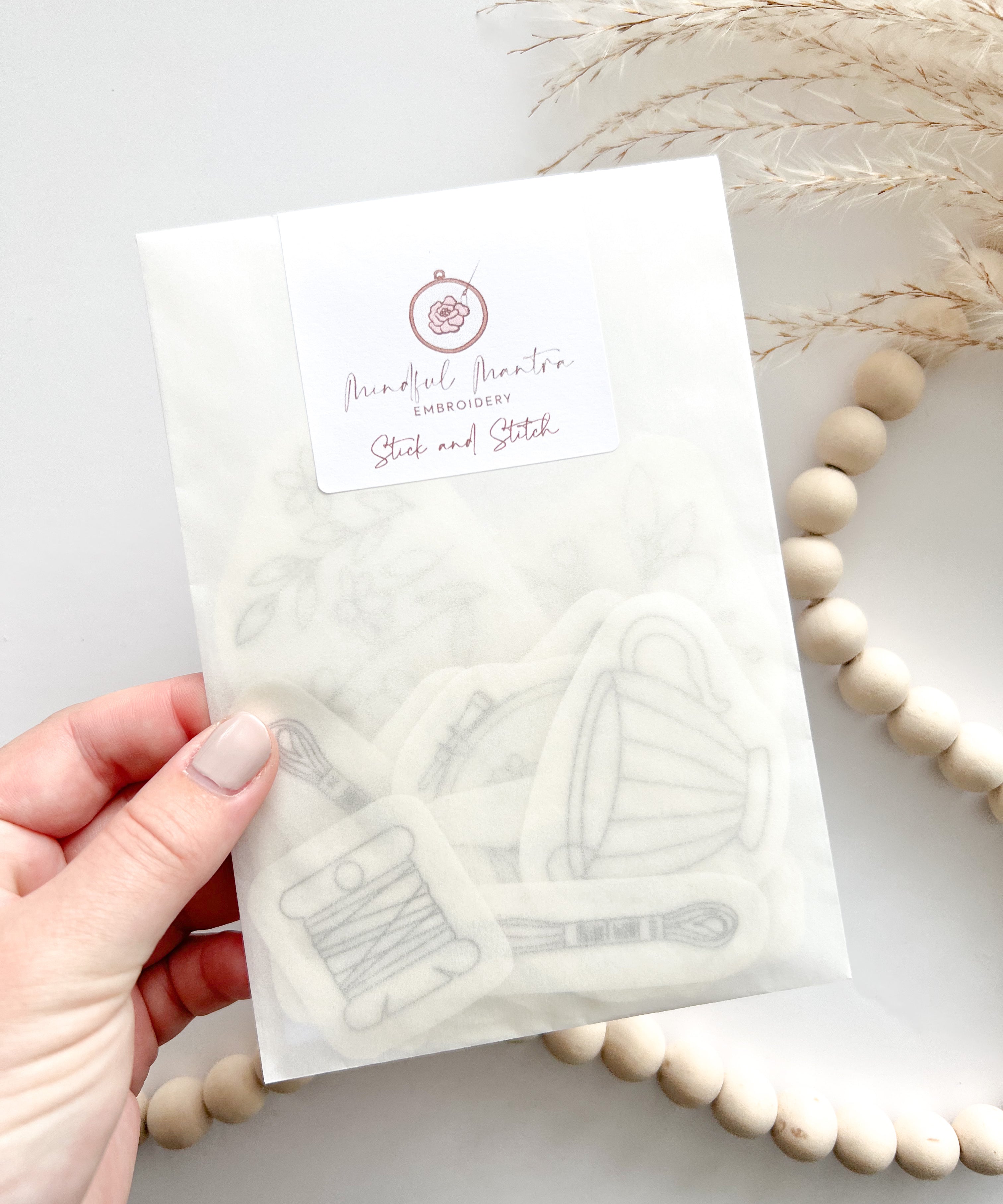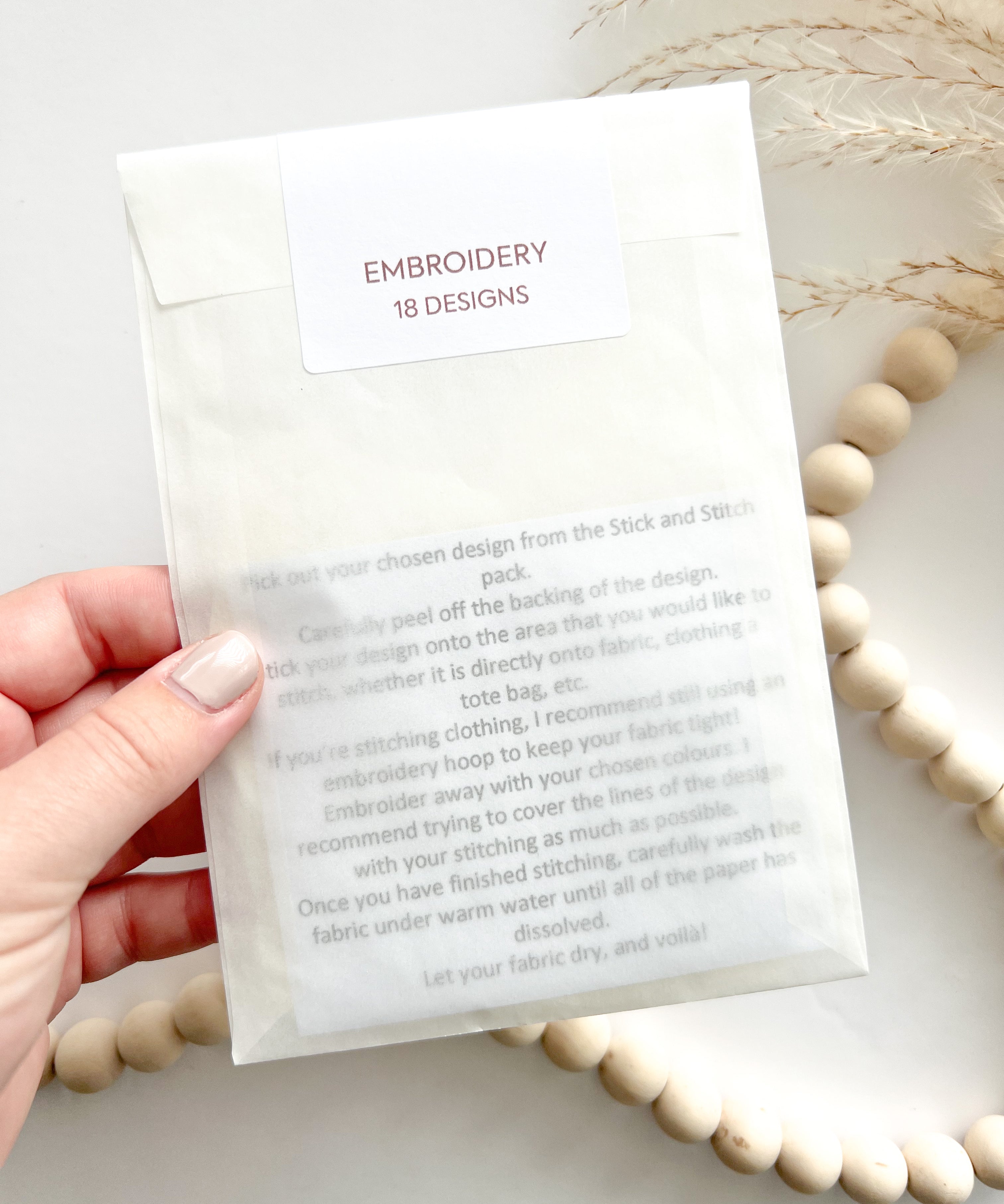 Carefully peel off the backing of the design, stick your design onto the area that you would like to stitch, (whether it is directly onto fabric, clothing a tote bag, etc), and stitch away! Once you're done, carefully wash the fabric under warm water until all of the paper has dissolved. Let your fabric dry, and voilà!