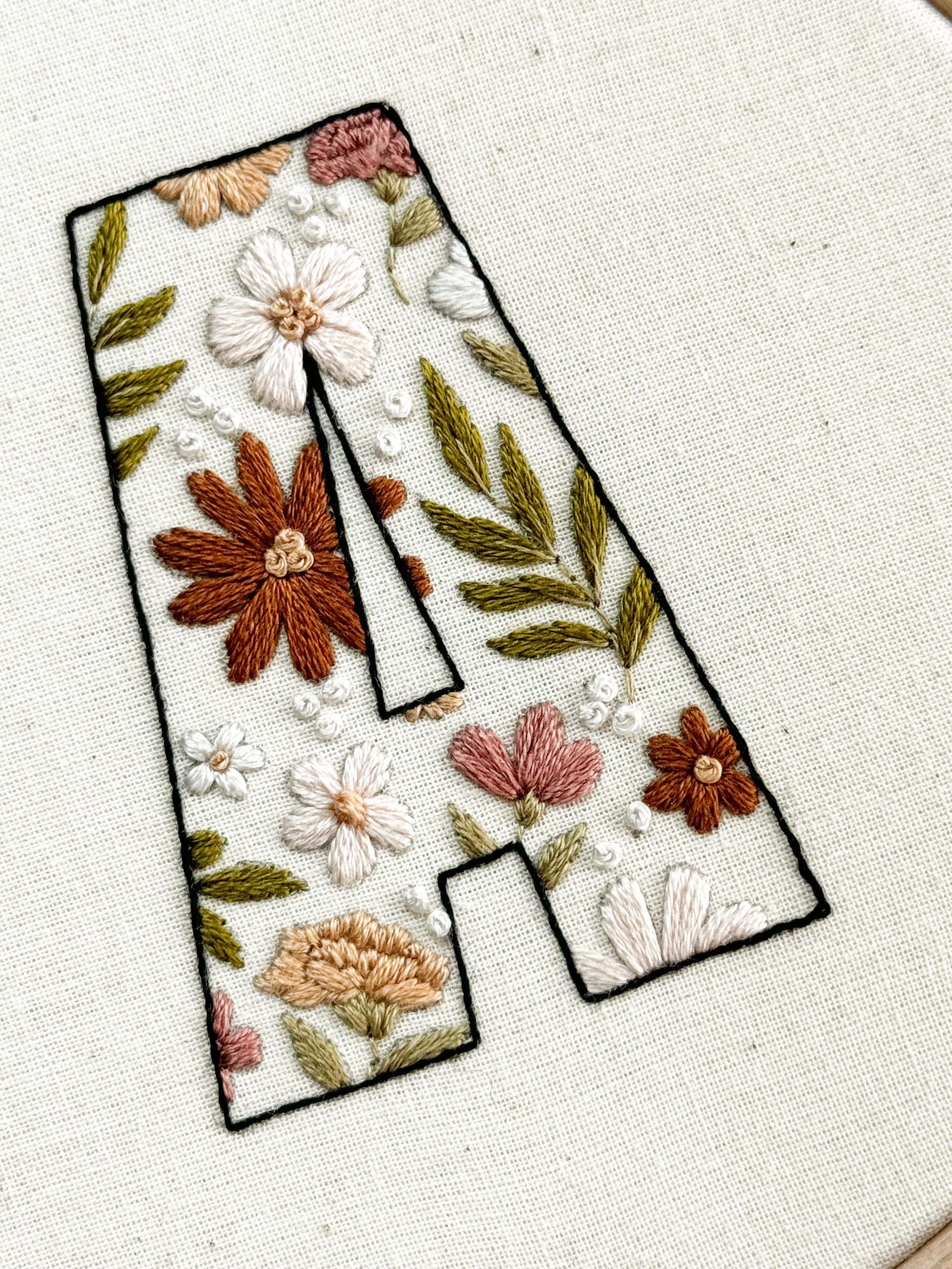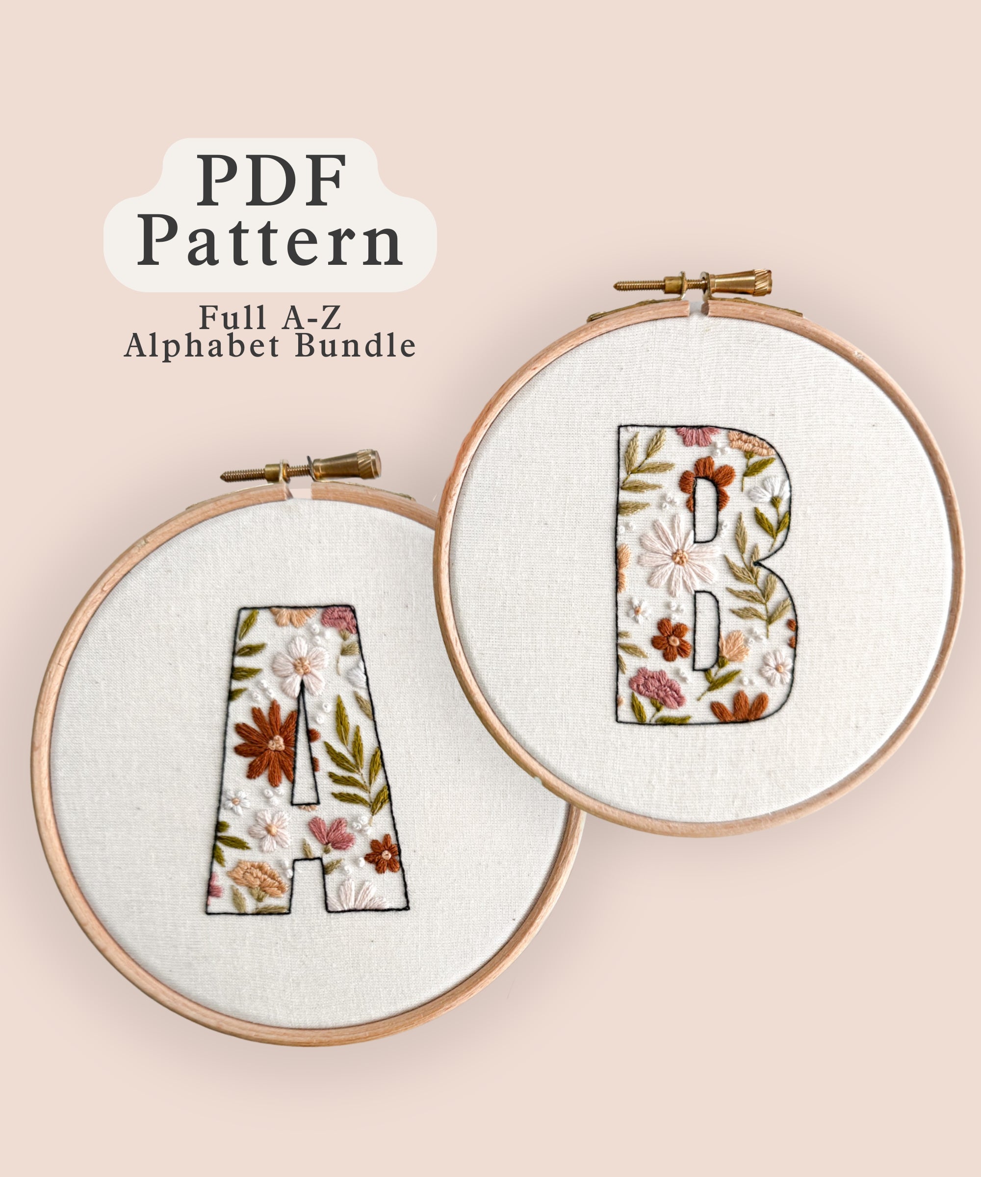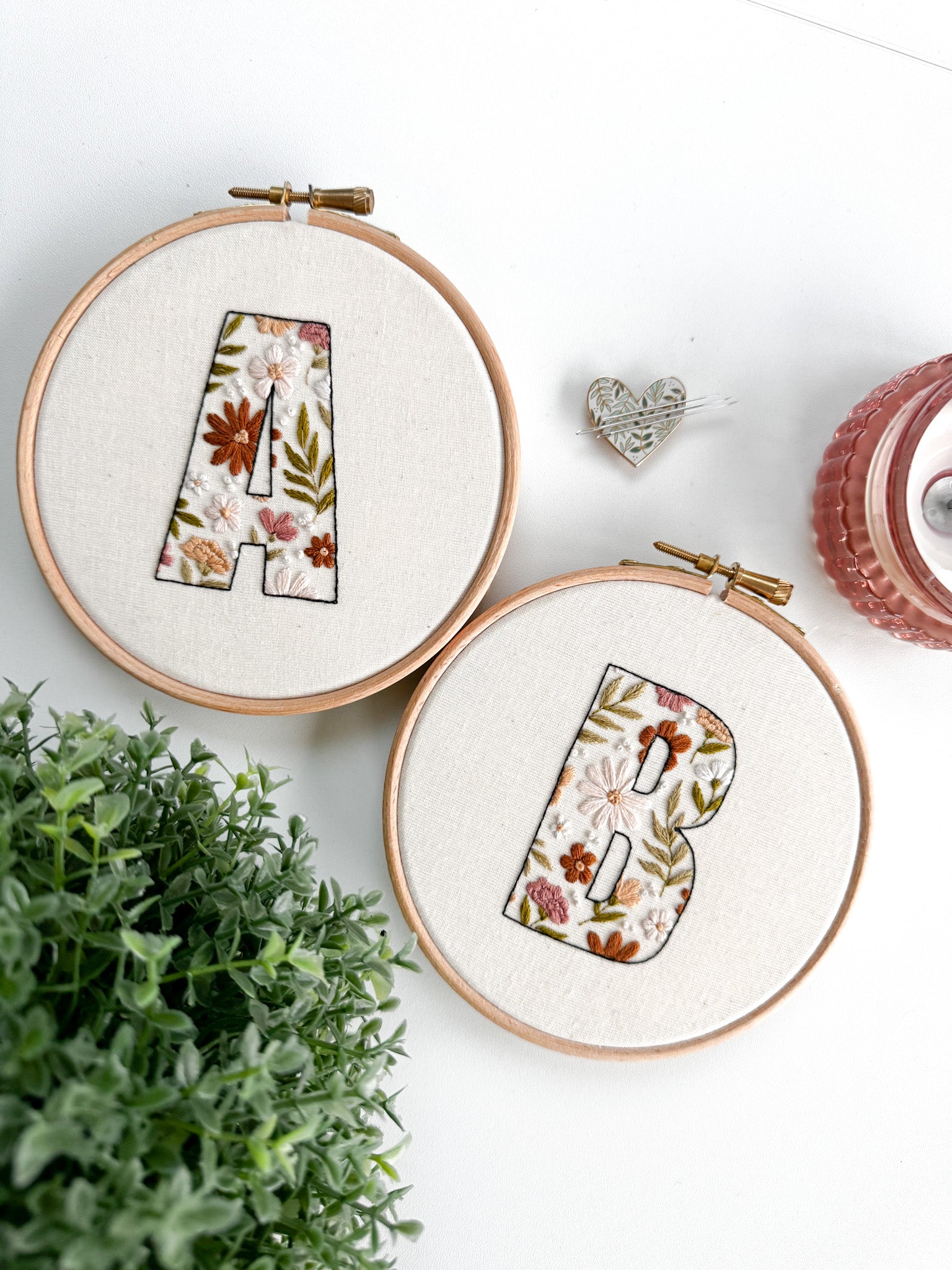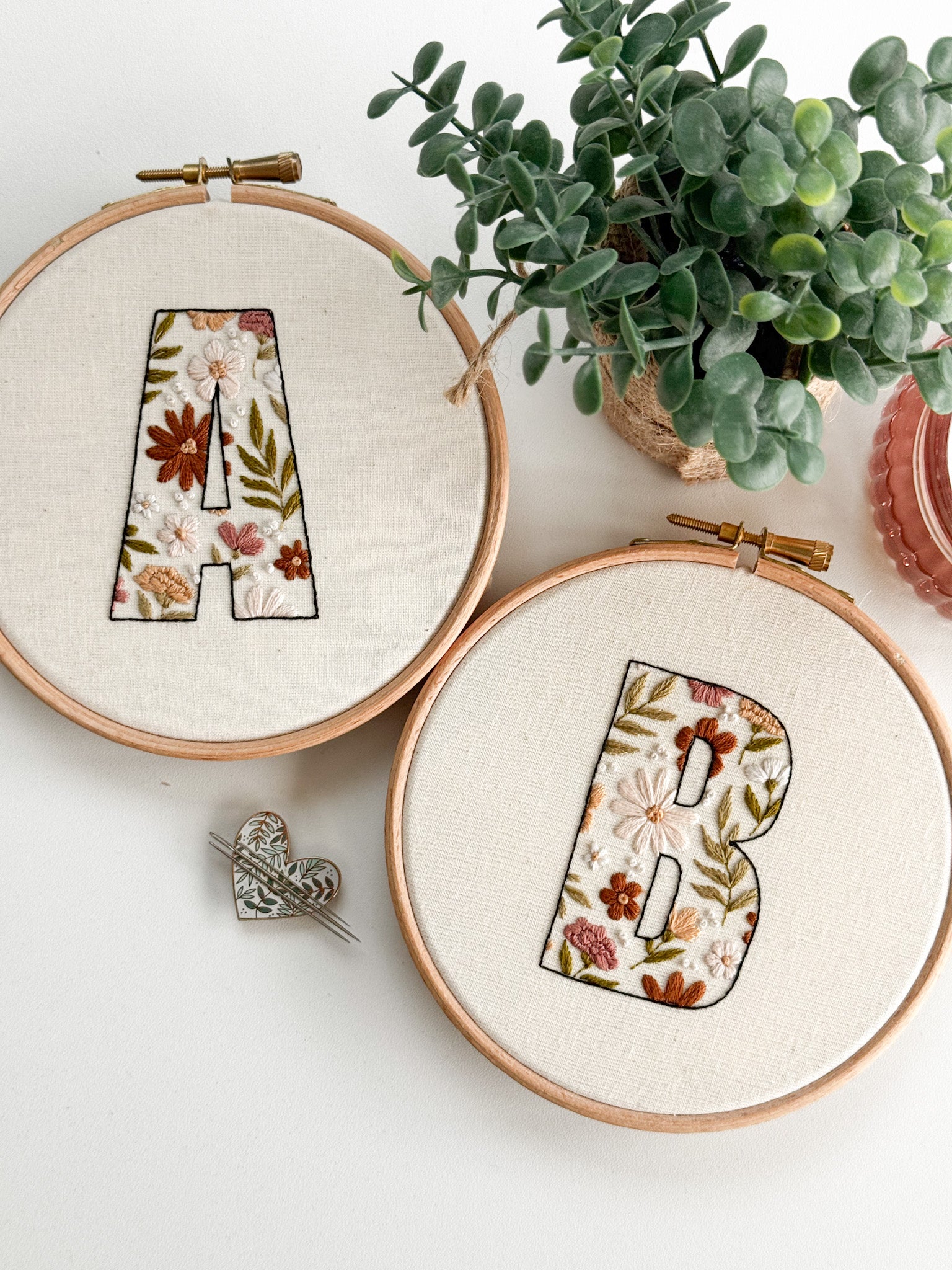 Create a beautifully personalised embroidery piece with our Floral-Filled Letters embroidery patterns, designed to help you stitch elegant, floral letters with confidence!