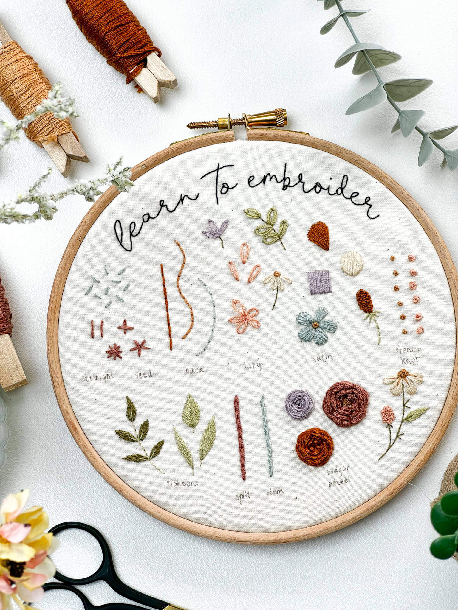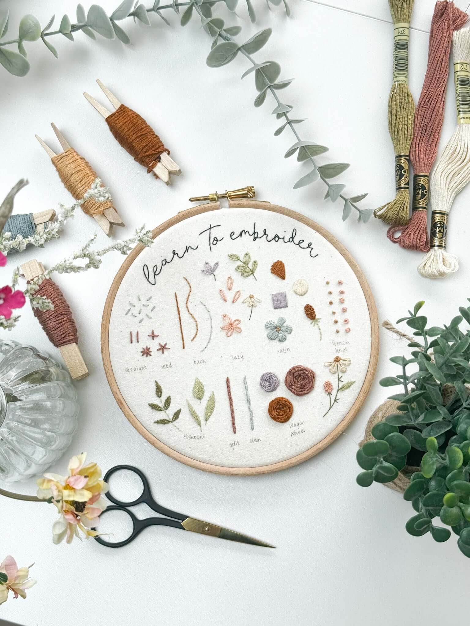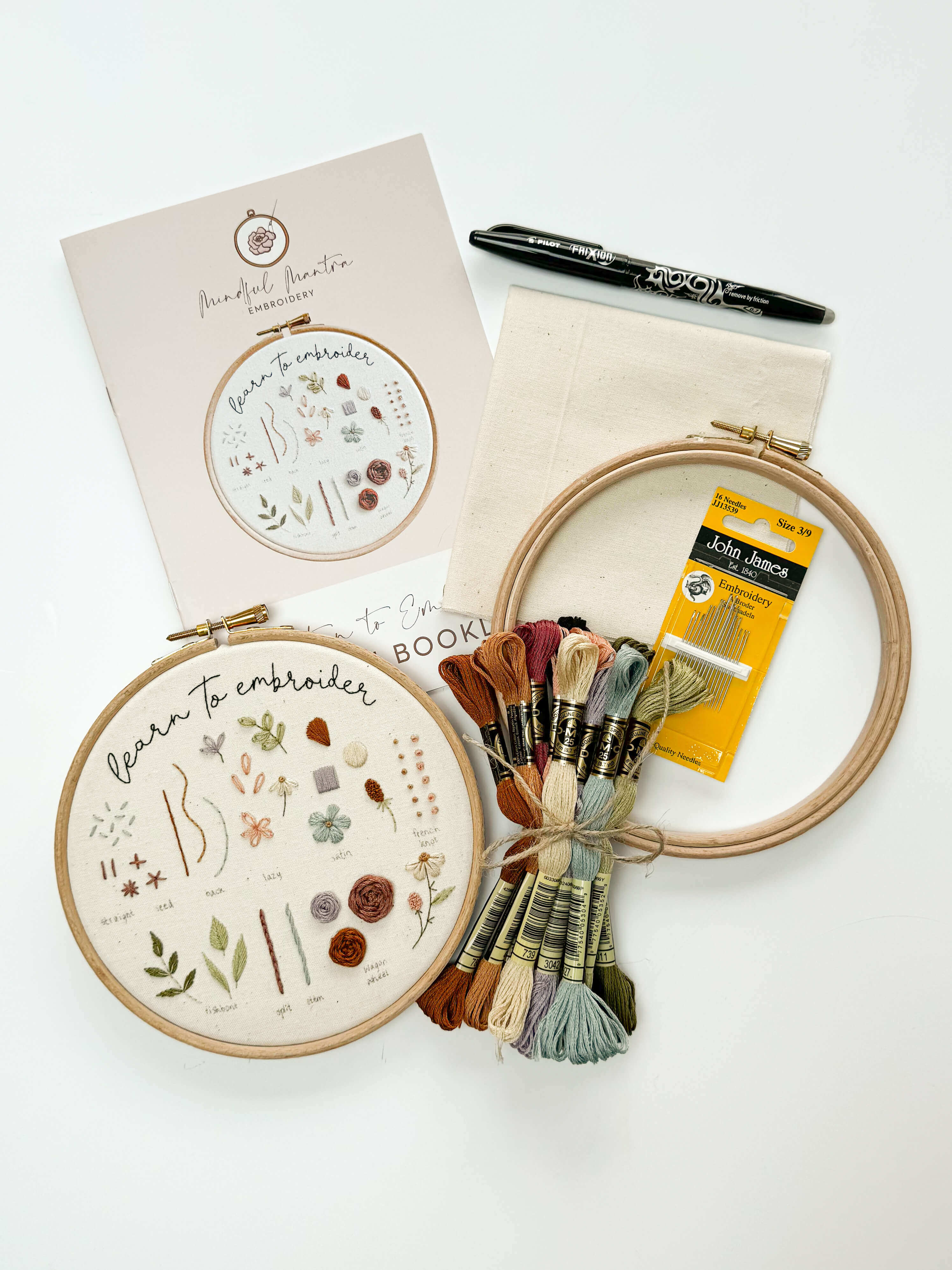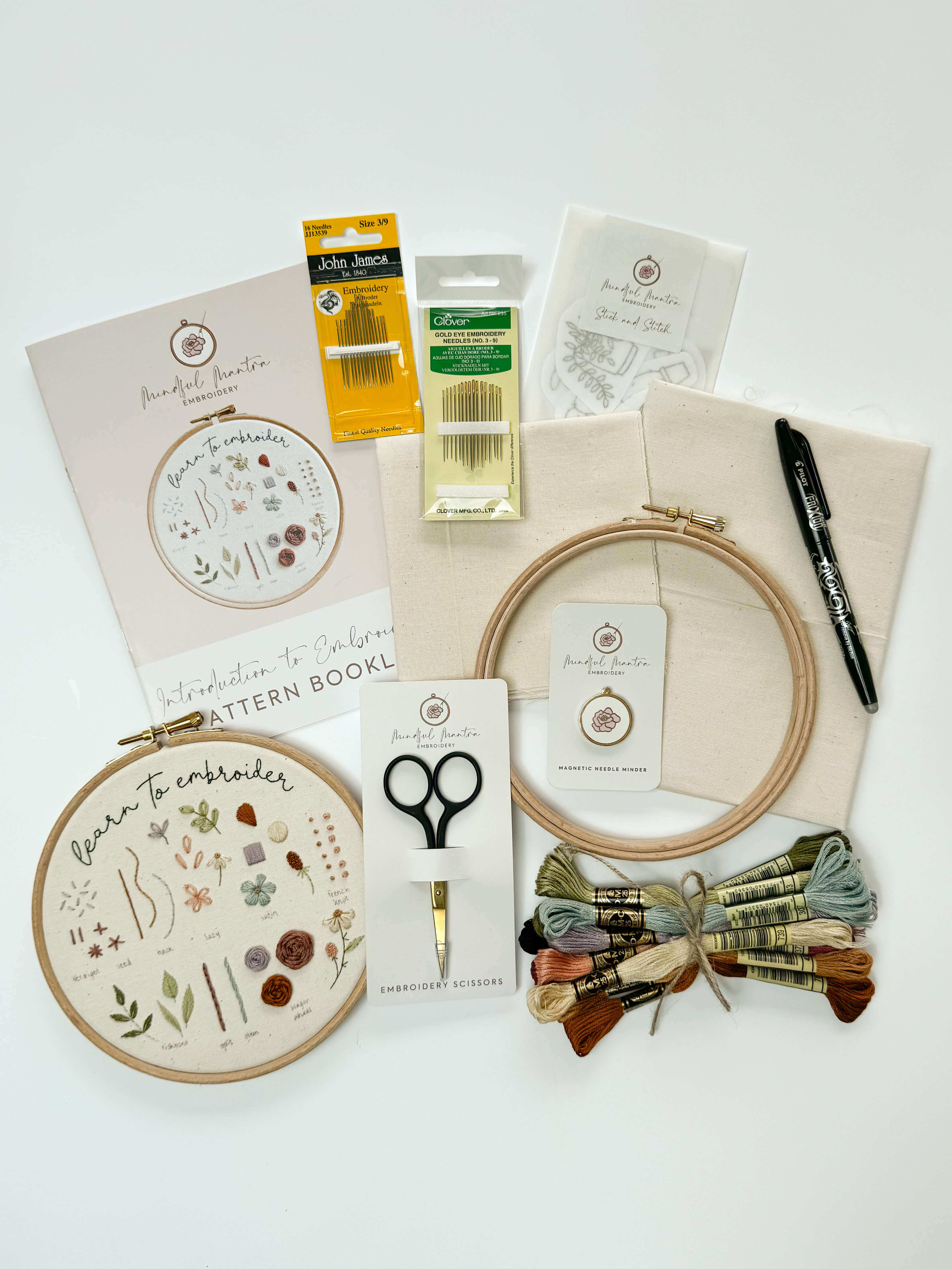 The embroidery kit includes the essentials you need to complete this hoop: