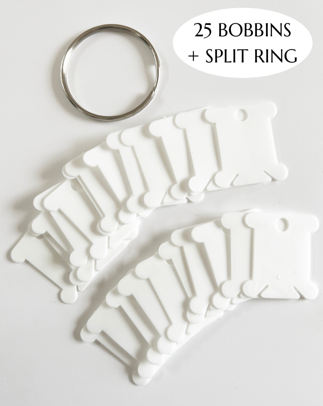 • 25 Plastic Floss Bobbins + 5cm Split Ring