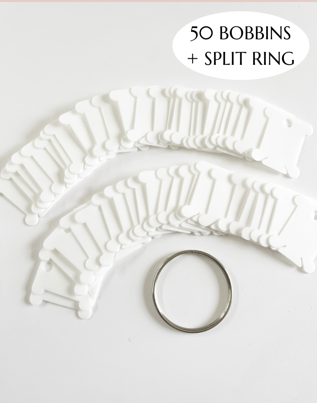 • 50 Plastic Floss Bobbins + 5cm Split Ring