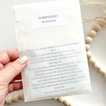 The designs vary in size (between 0.5” and 4") and have been designed to either stitch into embroidery hoops, on a tote bag, on clothing, cushions and more. Or, the pack itself can be given as a gift for a fellow creative.