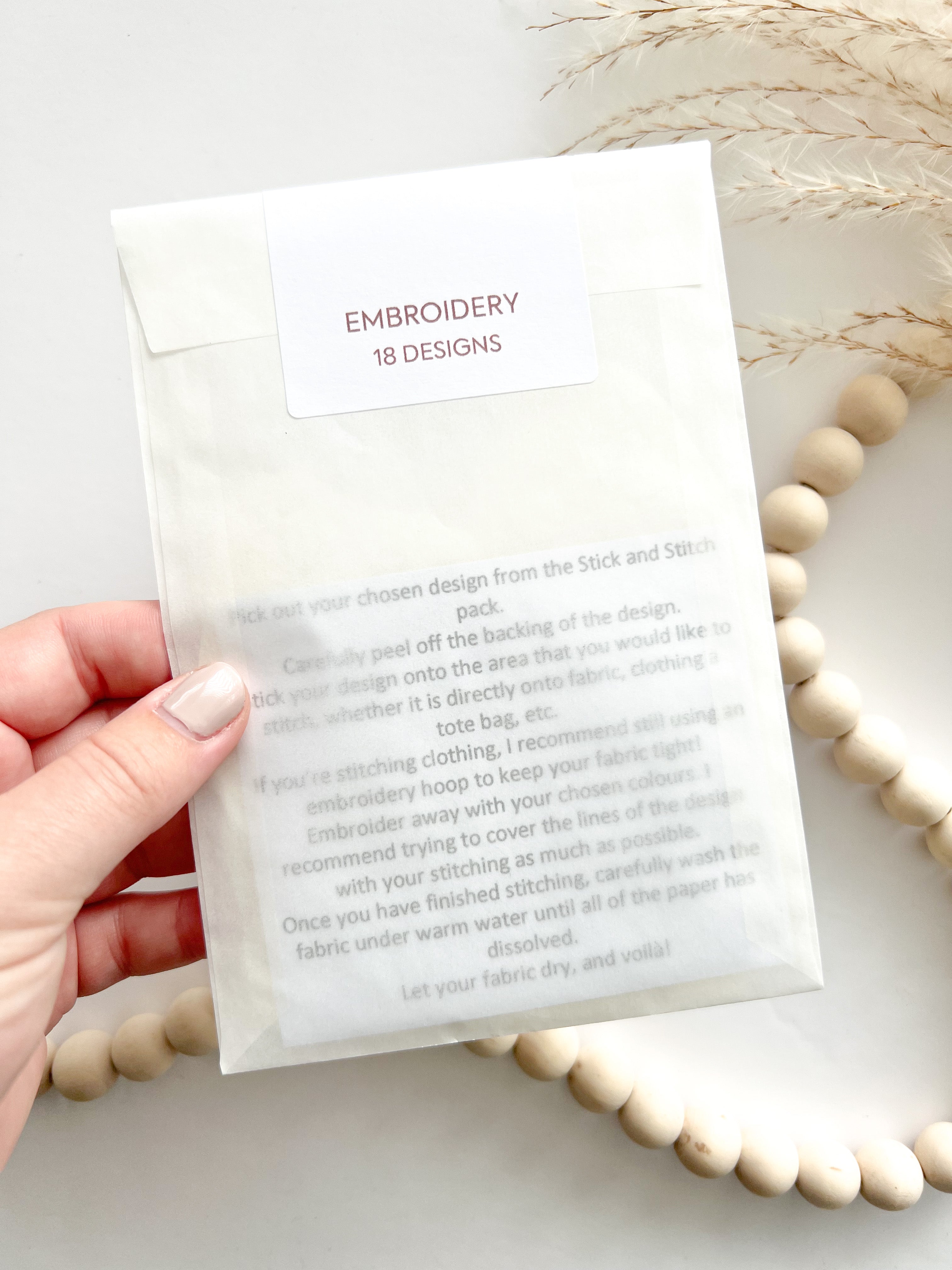 In order to use these stick and stitch designs, you need to peel off the backing of the design, stick it onto the desired area of fabric or clothing, and then embroider in your chosen colours. Once finished, wash the pattern away with warm water to leave just your stitching in place.